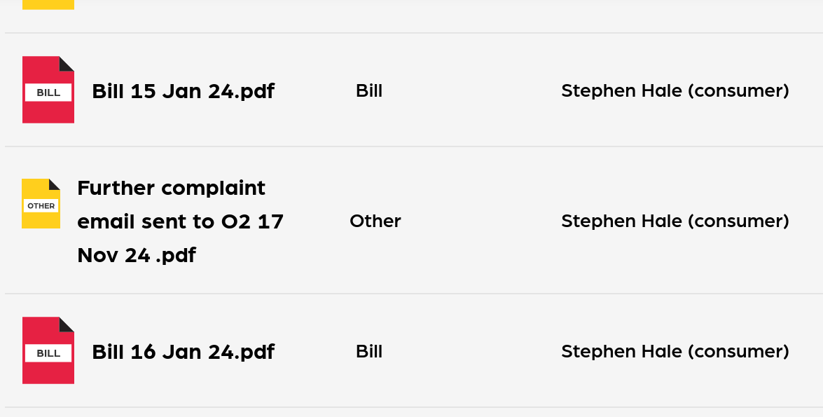 By contrast with the Virgin Media and O2 process, dealing with the Ombudsman was a delight. They had a process for verifying that I could act as a proxy. They assigned a case officer who phoned me to talk through the process. And they had a case management system which I used to upload the folder full of communications and complaints as evidence.