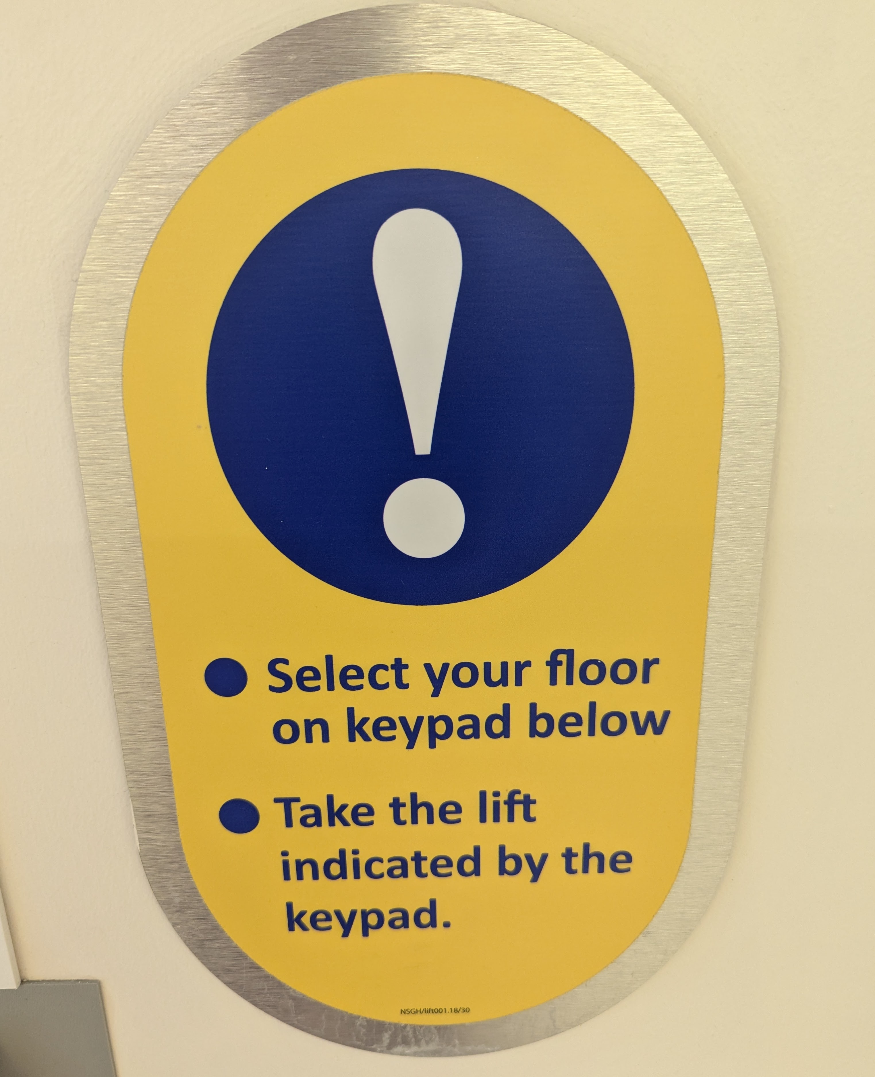 The design appears to break most people’s long established mental model for how they expect lifts to work. And to compensate for this, a rich ecosystem of signs and posters has evolved on the walls outside each lift: